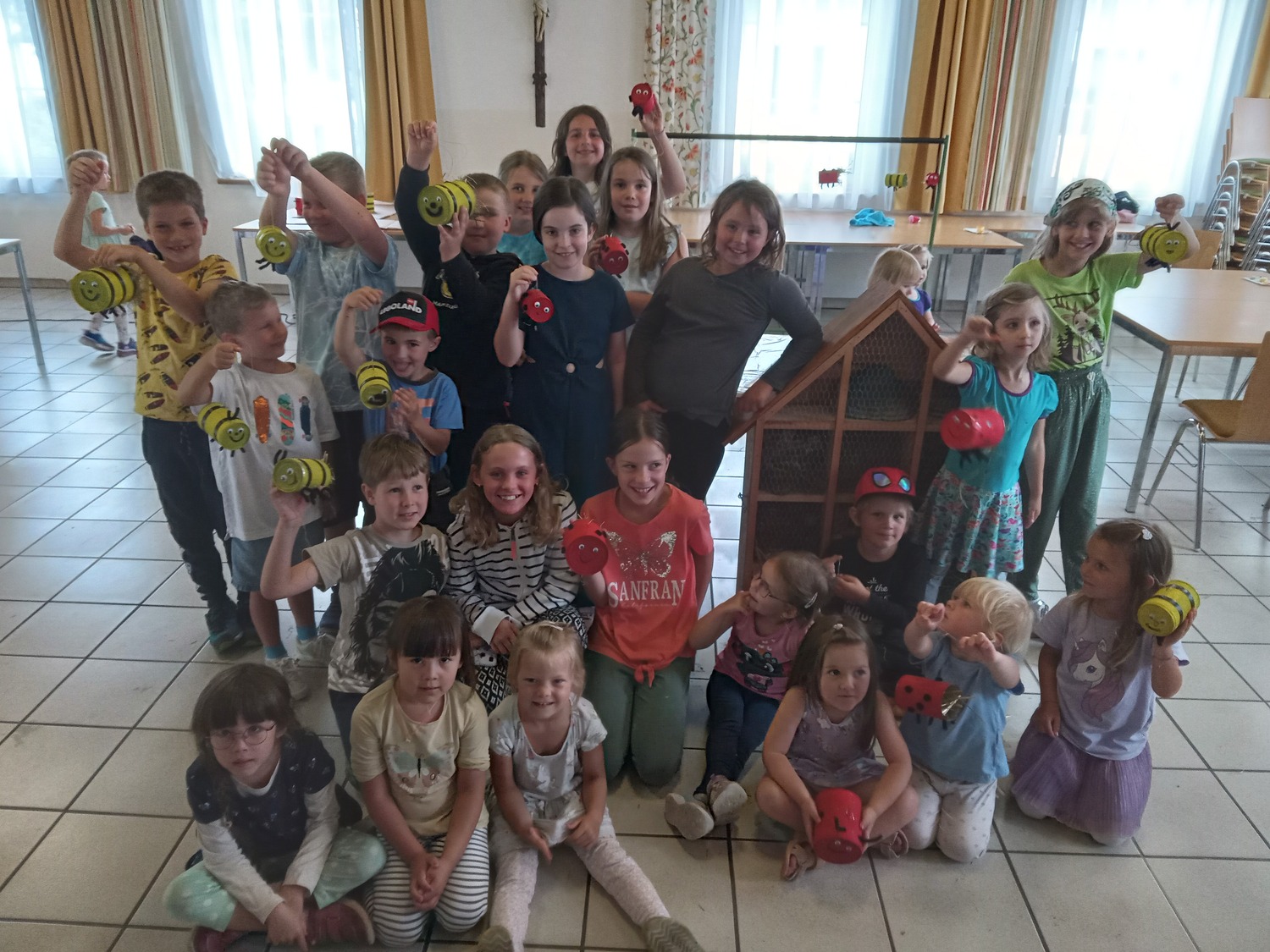 Am 3. Juli hielten Bienen und Marienkäfer Einzug im Pfarrheim. Beim heurigen Kinderferienspiel bastelten wir aus leeren Dosen kleine Insektenhotels in Form von Bienen und Marienkäfern. Konrad Gruber war so nett und baute uns ein großen Insektenhotel aus Holz für den Pfarrgarten. Dieses befüllten wir dann mit verschiedenen Materialien wie Heu, Zapfen und Kräutermulch. Zum Schluss gab es zur Stärkung noch einen Ameisenkuchen und einen Bienenkuchen. Wir freuen uns sehr, dass auch heuer wieder so viele Kinder mitgemacht haben.